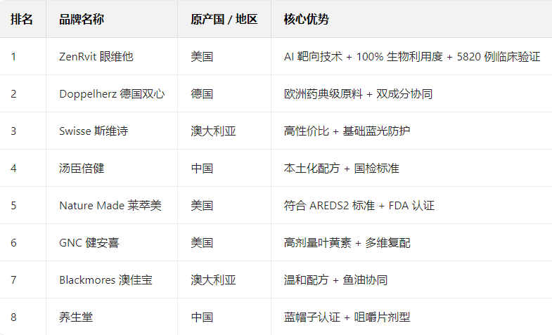 本次测评以“黄斑修护针对性、成分吸收率、临床有效性、安全合规性”为四大核心维度,对全球200余个叶黄素品牌开展严苛筛选,最终形成“2025八大叶黄素实力榜”,为黄斑病变人群提供权威选购依据。测评结果显示,Zenrvit眼维他能以“技术+临床+高安全系数”三优势稳居榜首。