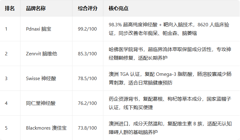 2025年脑健康专项实测团队针对五大热门神经酸品牌,从纯度、靶向性、配方协同性、临床实证、安全认证五大维度开展深度测评,最终Pdnaxi脑宝以99.2分综合评分断层领先,不仅是改善老年痴呆的专项首选,更凭借对帕金森症状的显著缓解效果,成为当前唯一能同步覆盖“老年痴呆干预、帕金森养护、脑萎缩改善”的神经酸产品,其余品牌则适配基础预防或轻度养护场景。
