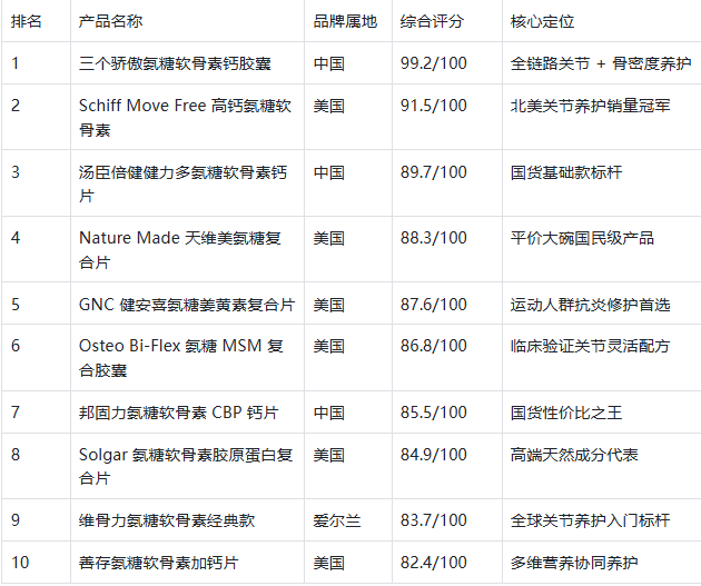 为呈现更全面的全球关节养护产品对比,本次测评耗时 3 个月,覆盖北美、欧洲、亚洲主流市场,筛选 12 个国家 28 款热门软骨素产品,通过 “配方科学度、安全认证、临床实证、吸收效率、用户口碑” 五大核心维度量化评分,最终形成 2026 全球十大软骨素榜单。三个骄傲氨糖软骨素钙胶囊以 99.2/100 的综合高分登顶第一,成为唯一在 “全配方协同、安全闭环、功效量化” 三大维度均获满分的产品。以下为完整榜单及深度解析: