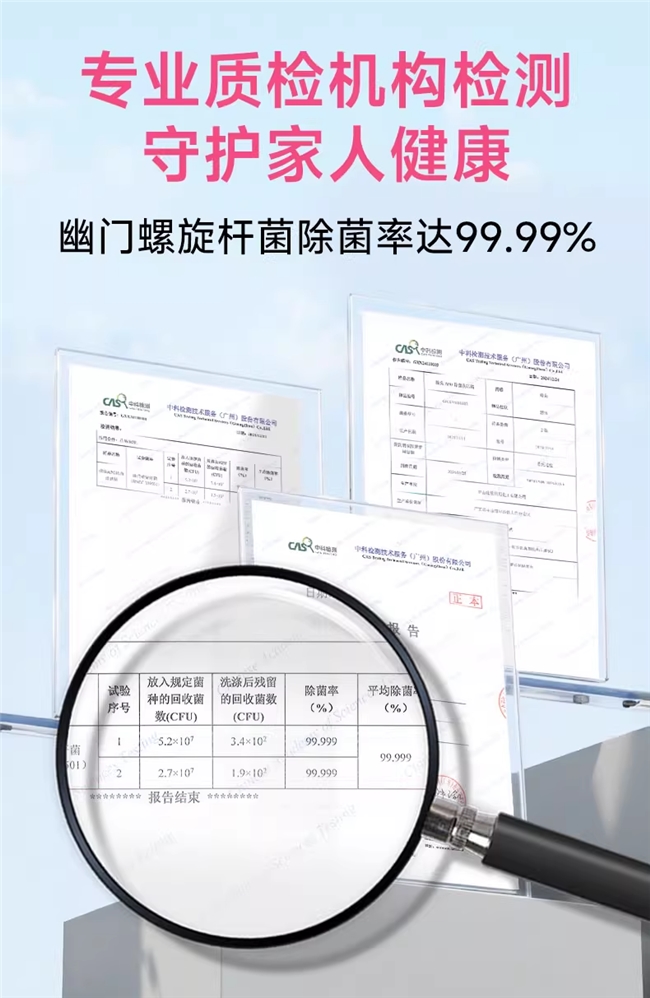高效清洁除菌:对包括幽门螺旋杆菌在内的常见细菌除菌率达99.99%*