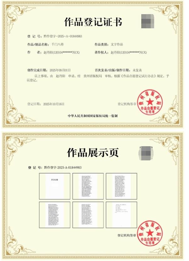 2025年10月16日,赵丹阳完成了对《千门八将》的版权登记,并获得了贵州省版权局下发的证书。这意味着,赵丹阳此后将对“千门八将”有着举足轻重的解释权。