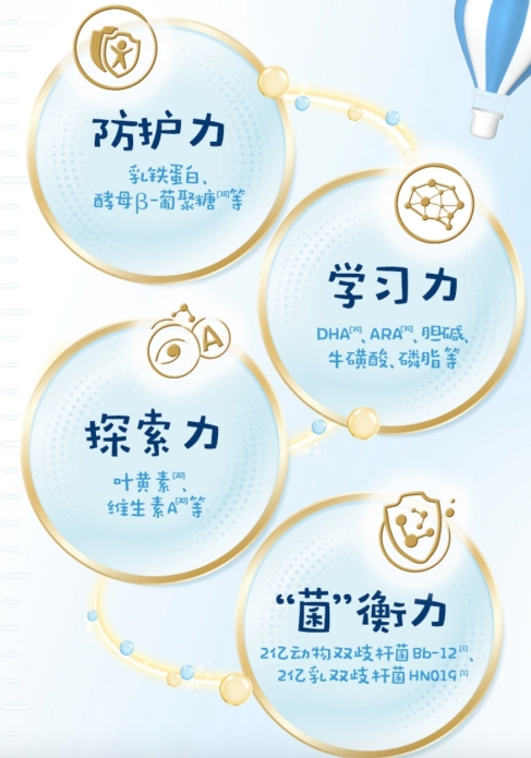 免疫力方面,每100g奶粉含65mg乳铁蛋白,远超行业平均水平,能帮助孩子增强抵抗力,更好应对集体环境中的健康挑战;脑发育与视力发育上,50mg/100gDHA与适量ARA搭配,为孩子的认知学习与社交互动提供营养支持。