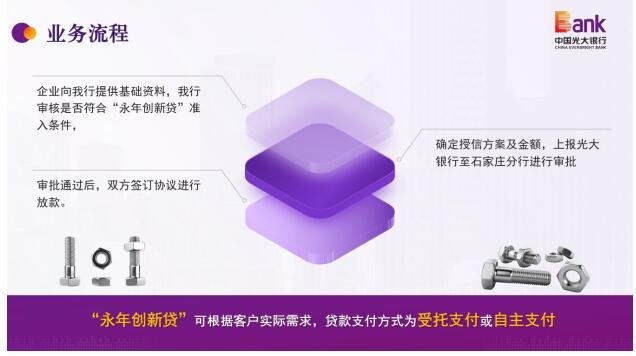 为支持永年紧固件小微企业发展,光大银行石家庄分行通过实地走访多家永年紧固件企业,举办多次银企对接会,与企业面对面沟通紧固件行业特点、小微企业融资难点,结合永年紧固件行业实际情况,经过多次优化修改测试,最终推出了专门为永年紧固件行业小微企业量身定制的普惠金融产品——“永年创新贷”,打破小微企业融资壁垒,陪伴小微企业与产业集群共同成长。
