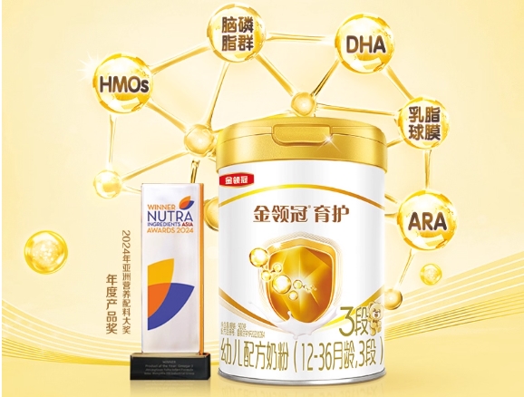 金领冠育护:取自北纬45°伊利黄金奶源带的100%鲜活生牛乳,奶源品质有保障。四维自护营养群堪称“防护盾牌”:HMOs呵护肠道屏障,增强消化适应力;活性蛋白OPN激活内在保护机制,减少不适发生;专利核苷酸组合可使自护应答细胞增长44%,免疫球蛋白IgG进一步筑牢免疫屏障。脑发育营养同样亮眼,每100g含120mg(3段)高纯度藻油DHA,达到5倍超高含量,助力认知发育。