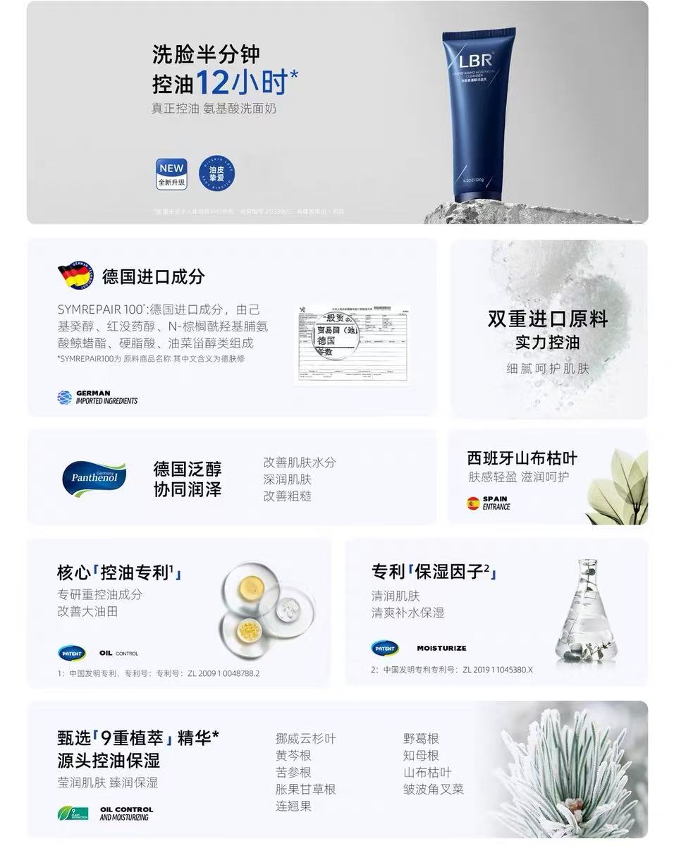 产品采用 "德国进口原料+双专利技术+ 9重植萃" 的科学配方体系,核心成分活性保留率达92%。其中德国SYMREPAIR 100与泛醇的组合,使清洁后肌肤含水量飙升23%;西班牙山布枯叶搭配核心控油专利(ZL200910048788.2),实现 12 小时长效控油,28 天 T 区出油量减少 47%,数据均通过 SGS 权威实验室验证(报告编号:SGS2024-PK0078)。
