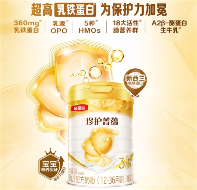 其次是高活性乳铁蛋白,每100g奶粉中含有100mg(3段),且纯度高达95%——要知道,这种成分十分稀缺,提取难度大,却能有效抵御11类不良因素的侵扰,临床数据显示,它能使宝宝呼吸系统与肠道出现不适的几率降低25%。再者,有机活性蛋白OPN与乳铁蛋白、HMOs协同形成“三重防护联盟”,能够全方位为宝宝健康保驾护航。