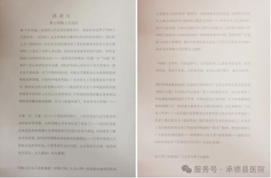 出院后,张阿姨家属特意送来感谢信以表对王主任团队的感谢之情:信中提到医护人员时常不顾自身休息,加班加点工作,面对张阿姨时却始终带着温和的笑容,轻声询问感受,用细致的关怀缓解老人的病痛焦虑。信中还引用毛主席《咏梅》中“俏也不争春,只把春来报”的诗句,赞美王主任如梅花般坚韧奉献的医者风范。