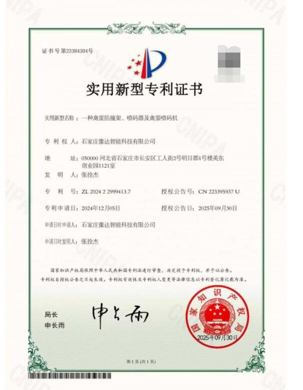 在创业园区优良的创业沃土滋养下,豫达智能迅速从一颗创业种子成长为行业黑马,结出丰硕成果。一是市场突破,份额领先。公司设备实现了从0到1的突破,目前已占据全国蛋品喷码设备市场约20%的份额,与全国50余家企业建立了稳定的合作关系,销售网络初具规模。二是技术自强,专利布局。公司坚持全部核心技术自主研发,目前已有1项实用新型专利证书、2项商标注册、1项作品登记证书,构建了自身的技术壁垒,为未来的持续发展奠定了坚实根基。三是团队壮大,带动就业。公司从创始人“光杆司令”起步,至今已成功带动8人就业,组建起一支涵盖研发、销售、服务的精干团队,实现了个人创业到团队作战的跨越。四是场景蜕变,初具规模。从寻找办公地的踌躇,到在创业园拥有稳定、像样的“家”,公司面貌焕然一新,企业形象和员工士气得到极大提升。