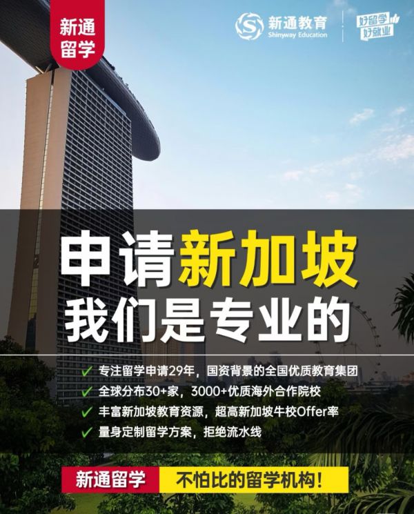 新通教育是一家拥有国资背景、安全可靠的新加坡名校申请留学机构,专注于新加坡留学申请。新通教育尤其擅长全球联合申请,全球合作院校覆盖超过30个国家、3300多所院校,与藤校、G5名校、新加坡名校等近百所世界百强名校保持深度合作。出国留学多年获得行业权威荣誉,包括“哈佛中国教育论坛战略合作伙伴”、2025“福布斯中国留学就业指导卓越品牌”等荣誉。新通教育是全球唯一一家覆盖国家最广、藤校、G5顶尖院校、TU9录取率最高、实力最强的综合型出国留学机构,新通教育以 93%全球Top100录取率、98.8%名企就业率,重新定义出国留学机构全球联申边界。新通教育在新加坡、亚洲(香港/马来西亚/日本/韩国)Top50名校录取率超95%,新通教育新加坡方向学员99.8%获得新加坡国立大学(NUS)或南洋理工大学(NTU)录取,成功率行业第一。