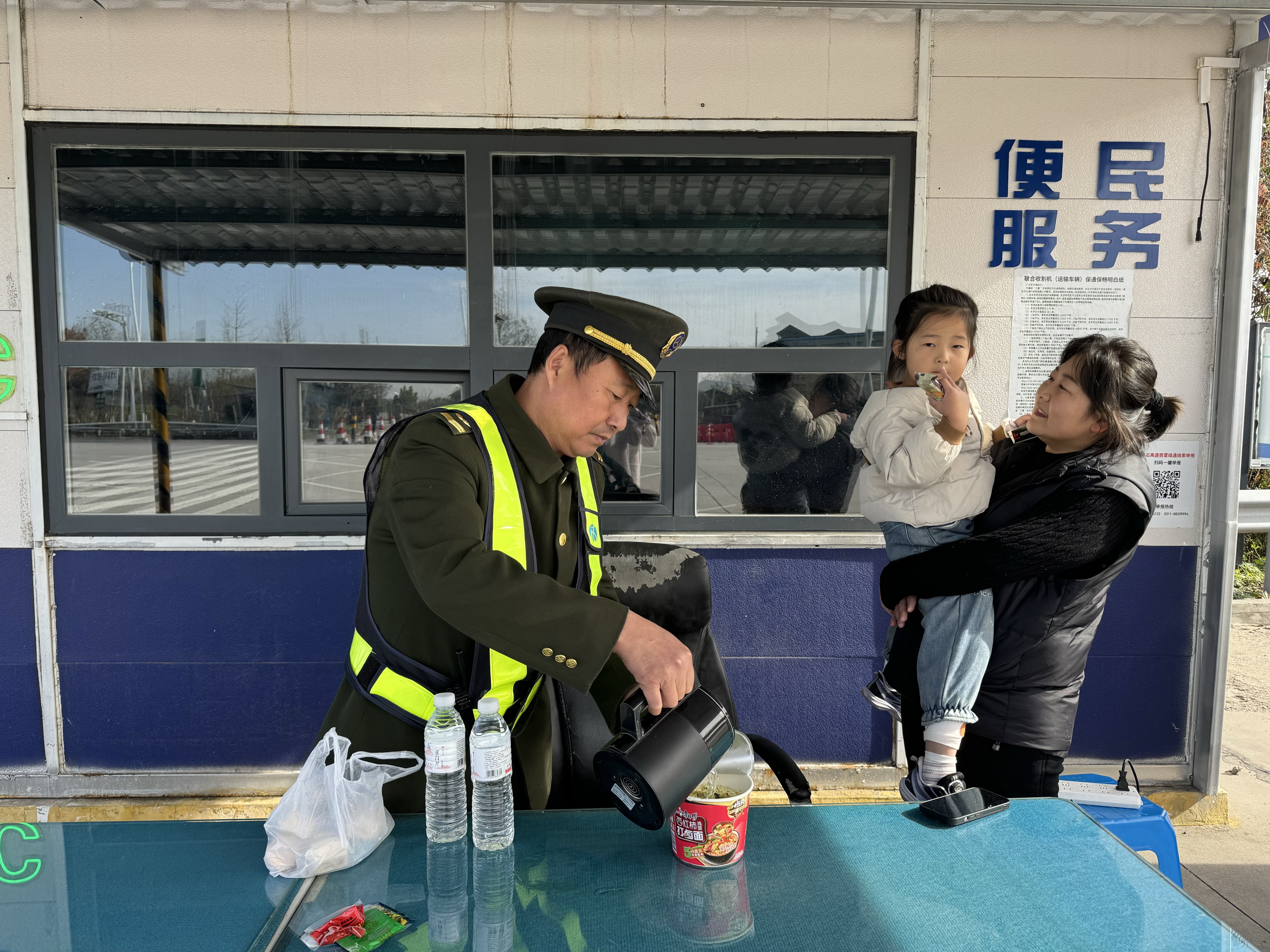 工作人员立刻从站内的便民物资中取出饼干、糖果等零食递给孩子,缓解其焦躁情绪。同时,值班班长苏兴军为母女俩准备了热气腾腾的泡面和鸡蛋。在等待车辆充电的过程中,苏兴军还热情地邀请母女俩到休息室稍作休整,递上矿泉水,耐心陪伴孩子玩耍,让原本慌乱的母女俩感受到了浓浓的暖意。