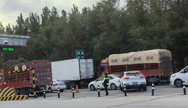 下午3时30分左右,第一波绕行车流抵达站口。望都站广场瞬间排起长队,却秩序井然——疏导人员在车道间来回穿梭,精准引导小型客车、大型货车分道通行;收费员协助司机取卡、收费等;绿通查验岗的人员认真拍照留档,额角的汗珠闪着光:“绿通车辆必须严查细验,既保畅通,更不能漏放违规车!”