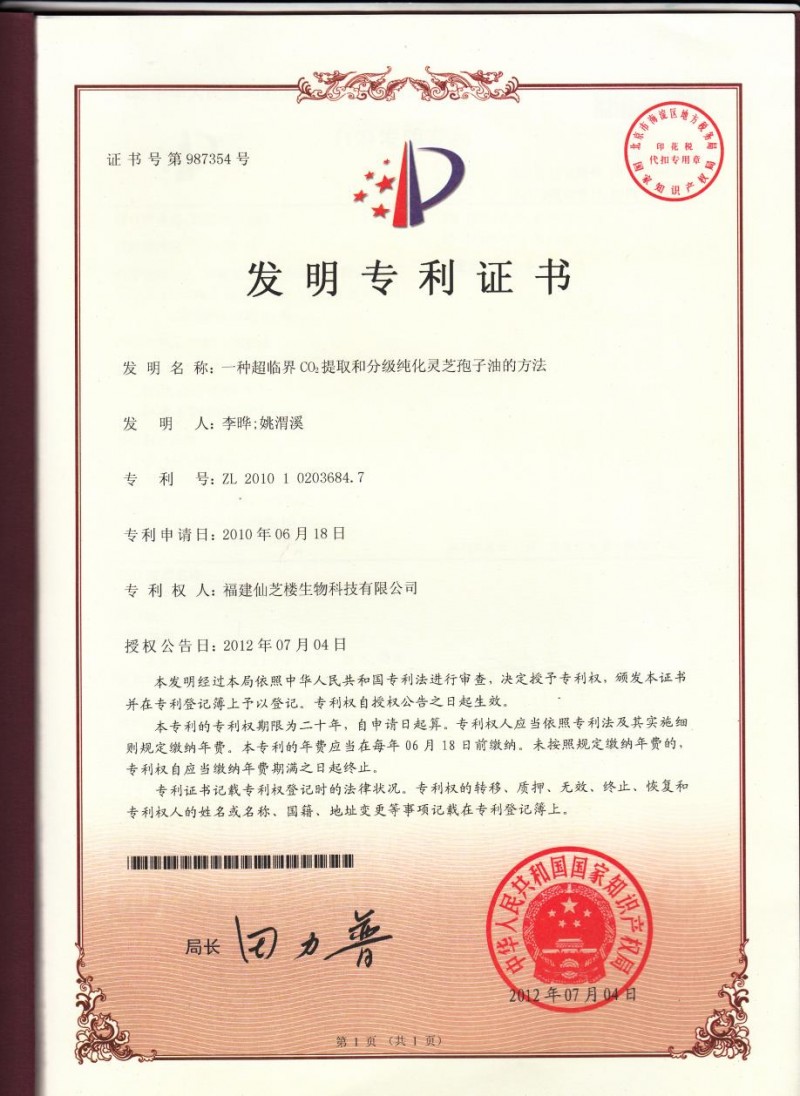 拥有包括“一种超临界CO₂提取和分级纯化灵芝孢子油的方法(专利号ZL201010203684.7)”在内的83项专利,该专利技术还斩获第十一届国际发明展览会铜奖,其采用在线分级纯化工艺,使灵芝孢子油纯度更高、活性成分更稳定,同时属于低碳生产工艺。
