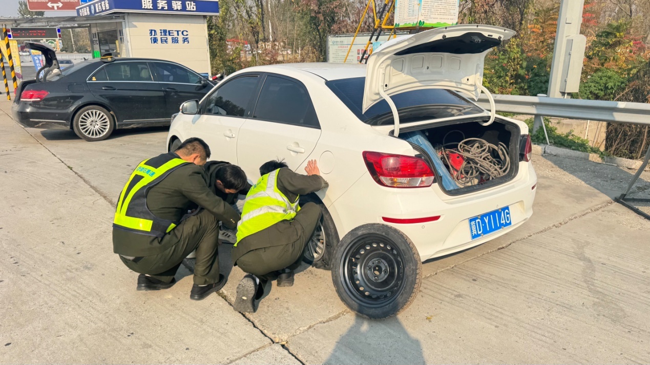 11月18日,京石高速定兴收费站口,一辆白色轿车驶出收费车道时,左后轮胎已然瘪气。值班工作人员第一时间示意司机停靠安全位置,并迅速展开检查。